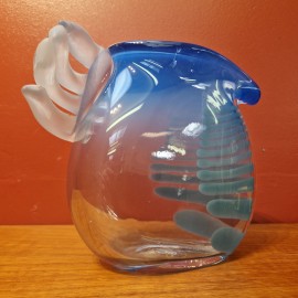1990's mouth blown blue glass by British glass artist Karlin Rushbrooke.Blue glass vase shaped like a jug that fades to clear glass at the base.A line of aqua stripes under the spout and on the other side of the vase are four frosted glass fingers that double as a handle.The base of the vase is signed.In amazing condition, no signs of wear.Height 1..